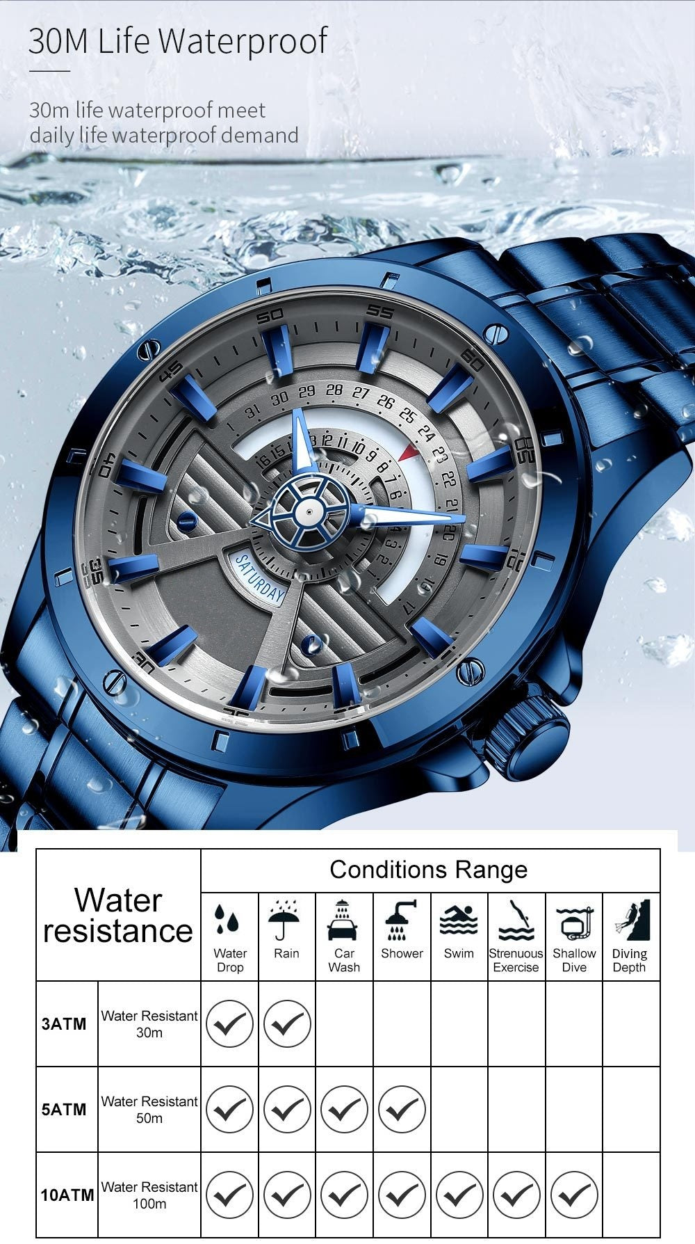 • Water Resistance Depth: 3Bar